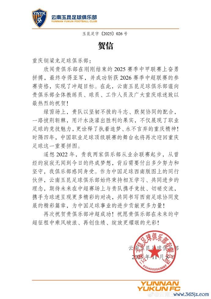 云南玉昆俱乐部发来贺信直播足球直播网,苏超直播并在官博配文写道:“祝贺重庆铜梁龙夺得2025赛季中甲职业联赛 第二名 !3年前,我们共同在业余赛场奋斗 ,三年后,我们终于在顶级职业联赛 相聚!西南古代足球 ,不堕青云志!”